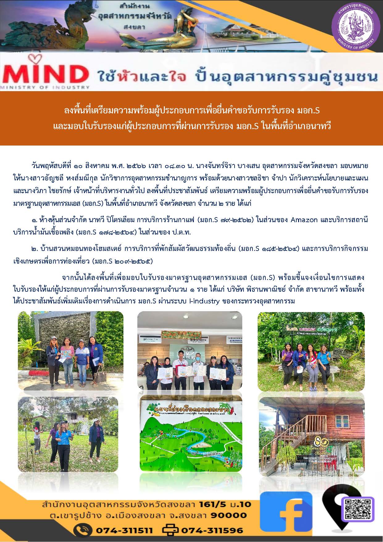 ลงพื้นที่เตรียมความพร้อมผู้ประกอบการเพื่อยื่นคำขอรับการรับรอง มอก.Sและมอบใบรับรองแก่ผู้ประกอบการที่ผ่านการรับรอง มอก.S ในพื้นที่อำเภอนาทวี