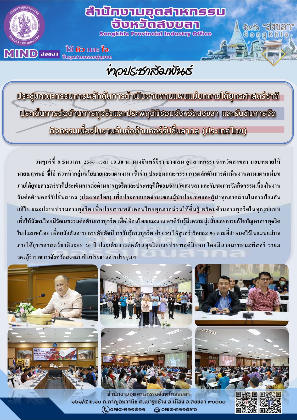 วันศุกร์ที่ 8 ธันวาคม 2566 เวลา 10.30 น. นางจันทร์จิรา บางเสน อุตสาหกรรมจังหวัดสงขลา มอบหมายให้ นายณฤพนธ์ ซี่โฮ่ หัวหน้ากลุ่มนโยบายและแผนงาน เข้าร่วมประชุมคณะกรรมการผลักดันการดำเนินงานตามแผนแม่บทภายใต้ยุทธศาสตร์ชาติประเด็นการต่อต้านการทุจริตและประพฤติมิชอบจังหวัดสงขลา และรับชมการจัดกิจกรรมเนื่องในงานวันต่อต้านคอร์รัปชั่นสากล (ประเทศไทย) เพื่อประกาศเจตจำนงของผู้นำประเทศและผู้นำทุกภาคส่วนในการป้องกัน แก้ไข และปราบปรามการทุจริต เพื่อประสานพลังคคนไทยทุกภาคส่วนให้ตื่นรู้ พร้อมต้านการทุจริตในทุกรูปแบบ เพื่อให้สังคมไทยมีวัฒนธรรมต่อต้านการทุจริต เพื่อให้คนไทยและนานาชาติรับรู้ถึงความมุ่งมั่นและการแก้ไขปัญหาการทุจริตในประเทศไทย เพื่อผลักดันการยกระดับดัชนีการรับรู้การทุจริต ค่า CPI ให้สูงกว่าร้อยละ 50 ตามที่กำหนดไว้ในแผนแม่บท ภายใต้ยุทธศาสตร์ชาติระยะ 20 ปี ประเด็นการต่อต้านทุจริตและประพฤติมิชอบ โดยมีนายมาหะมะพีสกรี วาแม รองผู้ว่าราชการจังหวัดสงขลา เป็นประธานการประชุมฯ