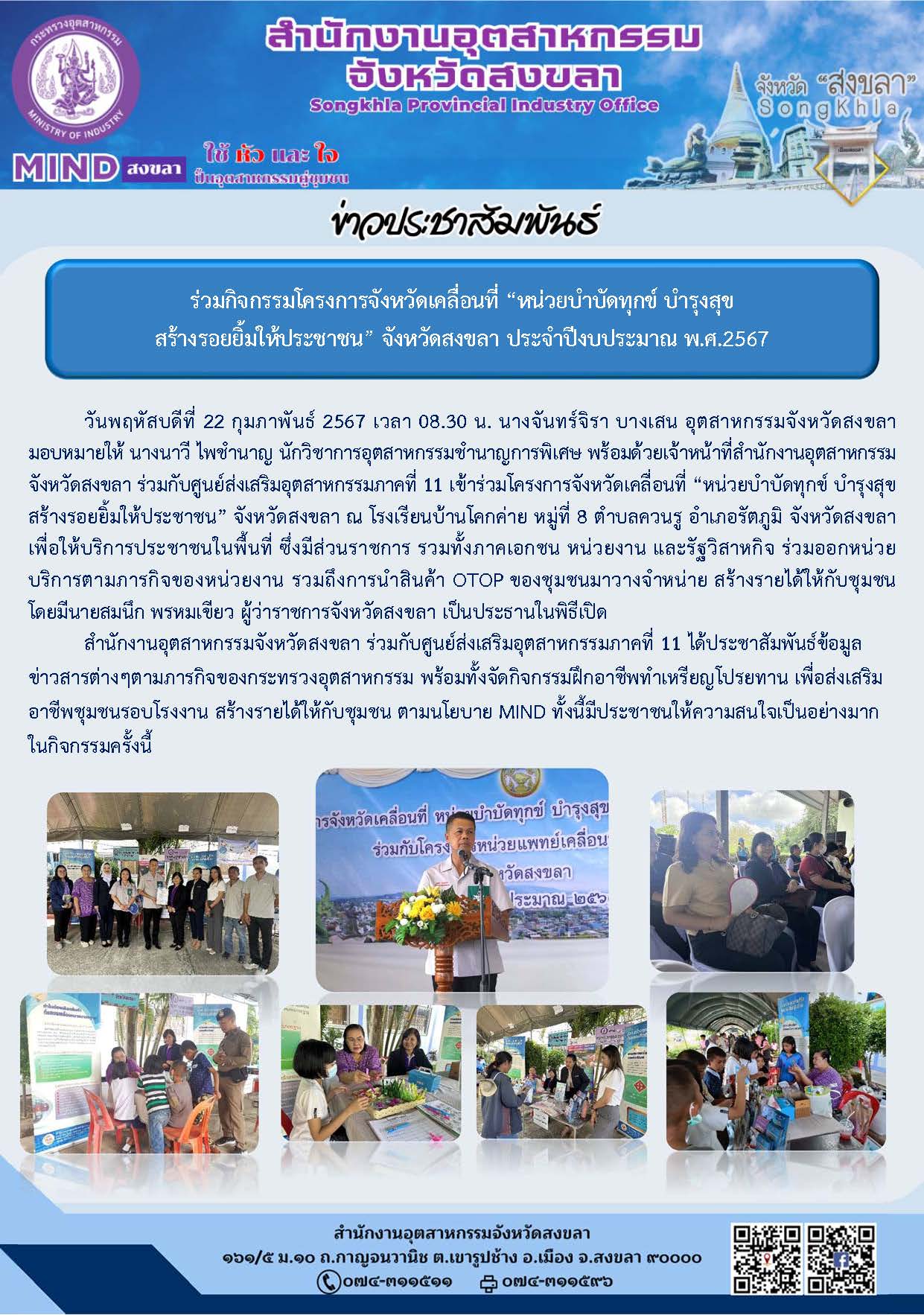 สร้างรอยยิ้มให้ประชาชน” จังหวัดสงขลา ประจำปีงบประมาณ พ.ศ.2567 วันพฤหัสบดีที่ 22 กุมภาพันธ์ 2567 เวลา 08.30 น. นางจันทร์จิรา บางเสน อุตสาหกรรมจังหวัดสงขลา มอบหมายให้ นางนาวี ไพชำนาญ นักวิชาการอุตสาหกรรมชำนาญการพิเศษ พร้อมด้วยเจ้าหน้าที่สำนักงานอุตสาหกรรมจังหวัดสงขลา ร่วมกับศูนย์ส่งเสริมอุตสาหกรรมภาคที่ 11 เข้าร่วมโครงการจังหวัดเคลื่อนที่ “หน่วยบำบัดทุกข์ บำรุงสุข สร้างรอยยิ้มให้ประชาชน” จังหวัดสงขลา ณ โรงเรียนบ้านโคกค่าย หมู่ที่ 8 ตำบลควนรู อำเภอรัตภูมิ จังหวัดสงขลา เพื่อให้บริการประชาชนในพื้นที่ ซึ่งมีส่วนราชการ รวมทั้งภาคเอกชน หน่วยงาน และรัฐวิสาหกิจ ร่วมออกหน่วยบริการตามภารกิจของหน่วยงาน รวมถึงการนำสินค้า OTOP ของชุมชนมาวางจำหน่าย สร้างรายได้ให้กับชุมชน โดยมีนายสมนึก พรหมเขียว ผู้ว่าราชการจังหวัดสงขลา เป็นประธานในพิธีเปิด