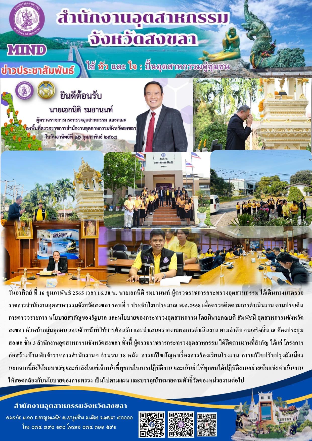วันอาทิตย์ ที่ 16 กุมภาพันธ์ 2565 เวลา 16.30 น. นายเอกนิติ รมยานนท์ ผู้ตรวจราชการกระทรวงอุตสาหกรรม ได้เดินทางมาตรวจราชการสำนักงานอุตสาหกรรมจังหวัดสงขลา รอบที่ 1 ประจำปีงบประมาณ พ.ศ.2568 เพื่อตรวจติดตามการดำเนินงาน ตามประเด็นการตรวจราชการ นโยบายสำคัญของรัฐบาล และนโยบายของกระทรวงอุตสาหกรรม โดยมีนายคณบดี สัมพัชนี อุตสาหกรรมจังหวัดสงขลา หัวหน้ากลุ่มทุกคน และเจ้าหน้าที่ ให้การต้อนรับ และนำเสนอรายงานผลการดำเนินงาน ตามลำดับ จนเสร็จสิ้น ณ ห้องประชุมสองเล ชั้น 3 สำนักงานอุตสาหกรรมจังหวัดสงขลา ทั้งนี้ ผู้ตรวจราชการกระทรวงอุตสาหกรรม ได้ติดตามงานที่สำคัญ ได้แก่ โครงการก่อสร้างบ้านพักข้าราชการสำนักงานฯ จำนวน 18 หลัง การแก้ไขปัญหาเรื่องการร้องเรียนโรงงาน การแก้ไขปรับปรุงแก้ไขผังเมือง นอกจากนี้ยังได้มอบขวัญและกำลังใจแก่เจ้าหน้าที่ทุกคนในการปฏิบัติงาน และเน้นย้ำให้ทุกคนได้ปฏิบัติงานอย่างเข้มแข็ง ดำเนินงานให้สอดคล้องกับนโยบายของกระทรวง เป็นไปตามแผน และบรรลุเป้าหมายตามตัวชี้วัดของหน่วยงานต่อไป
