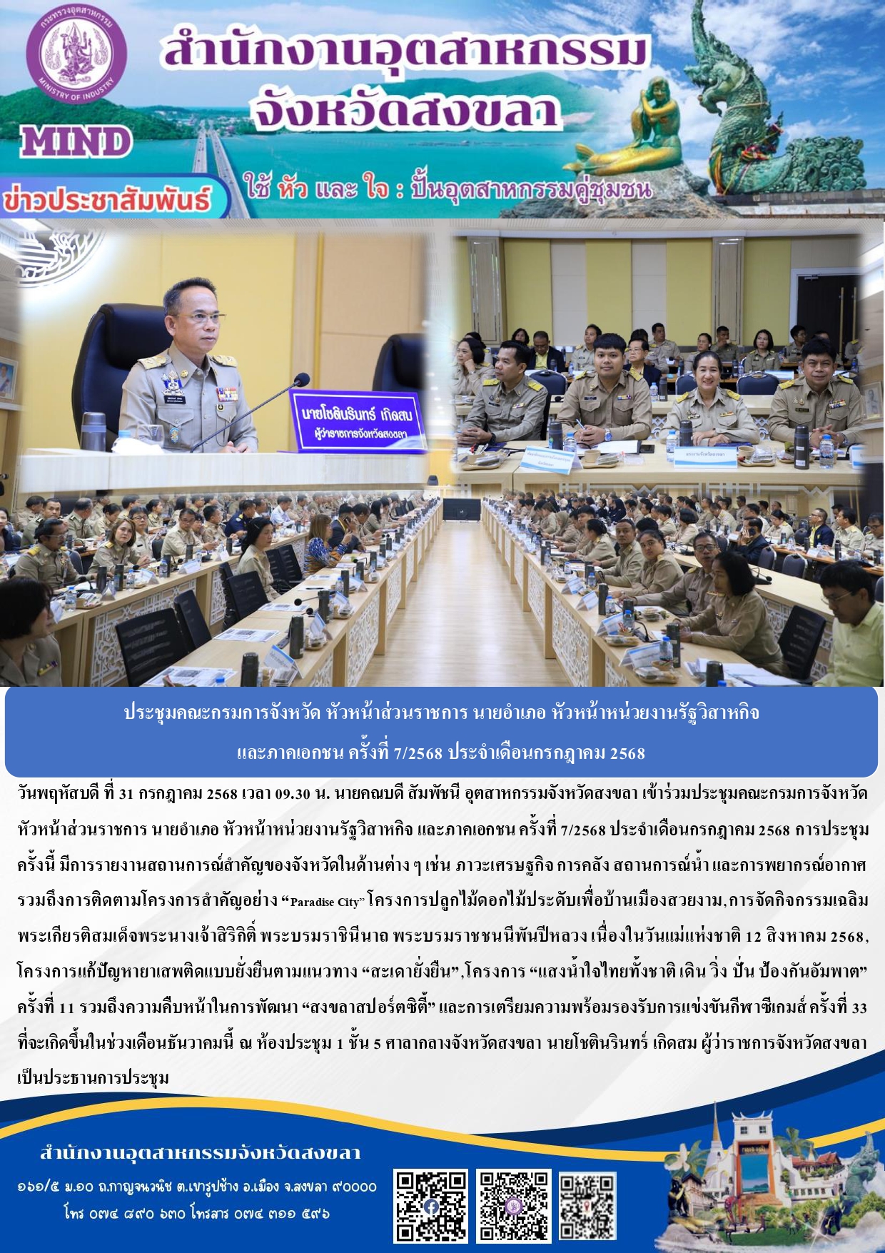 วันพฤหัสบดี ที่ 31 กรกฎาคม 2568 เวลา 09.30 น. นายคณบดี สัมพัชนี อุตสาหกรรมจังหวัดสงขลา เข้าร่วมประชุมคณะกรมการจังหวัด หัวหน้าส่วนราชการ นายอำเภอ หัวหน้าหน่วยงานรัฐวิสาหกิจ และภาคเอกชน ครั้งที่ 7/2568 ประจำเดือนกรกฎาคม 2568 การประชุมครั้งนี้ มีการรายงานสถานการณ์สำคัญของจังหวัดในด้านต่าง ๆ เช่น ภาวะเศรษฐกิจ การคลัง สถานการณ์น้ำ และการพยากรณ์อากาศ รวมถึงการติดตามโครงการสำคัญอย่าง “Paradise City” โครงการปลูกไม้ดอกไม้ประดับเพื่อบ้านเมืองสวยงาม, การจัดกิจกรรมเฉลิม พระเกียรติสมเด็จพระนางเจ้าสิริกิติ์ พระบรมราชินีนาถ พระบรมราชชนนีพันปีหลวง เนื่องในวันแม่แห่งชาติ 12 สิงหาคม 2568, โครงการแก้ปัญหายาเสพติดแบบยั่งยืนตามแนวทาง “สะเดายั่งยืน”, โครงการ “แสงน้ำใจไทยทั้งชาติ เดิน วิ่ง ปั่น ป้องกันอัมพาต” ครั้งที่ 11 รวมถึงความคืบหน้าในการพัฒนา “สงขลาสปอร์ตซิตี้” และการเตรียมความพร้อมรองรับการแข่งขันกีฬาซีเกมส์ ครั้งที่ 33 ที่จะเกิดขึ้นในช่วงเดือนธันวาคมนี้ ณ ห้องประชุม 1 ชั้น 5 ศาลากลางจังหวัดสงขลา นายโชตินรินทร์ เกิดสม ผู้ว่าราชการจังหวัดสงขลา เป็นประธานการประชุม