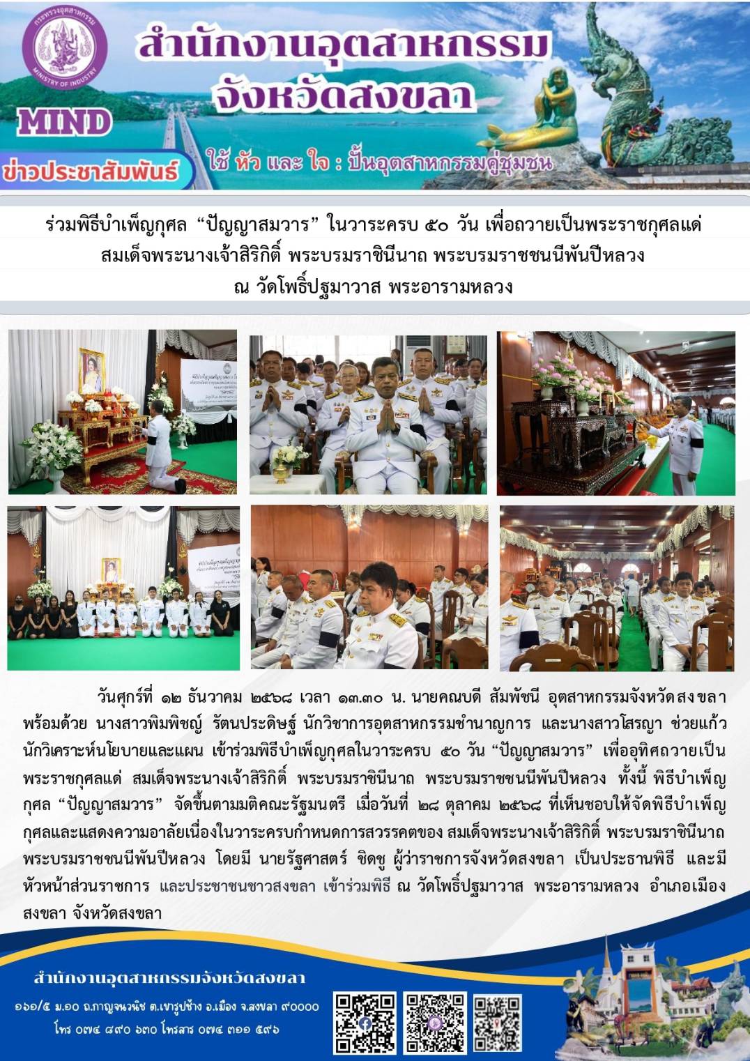 วันศุกร์ที่ 12 ธันวาคม 2568 เวลา 13.30 น. นายคณบดี สัมพัชนี อุตสาหกรรมจังหวัดสงขลา พร้อมด้วย นางสาวพิมพิชญ์ รัตนประดิษฐ์ นักวิชาการอุตสาหกรรมชำนาญการ และนางสาวโสรญา ช่วยแก้ว นักวิเคราะห์นโยบายและแผน เข้าร่วมพิธีบำเพ็ญกุศลในวาระครบ 50 วัน “ปัญญาสมวาร” เพื่ออุทิศถวายเป็น