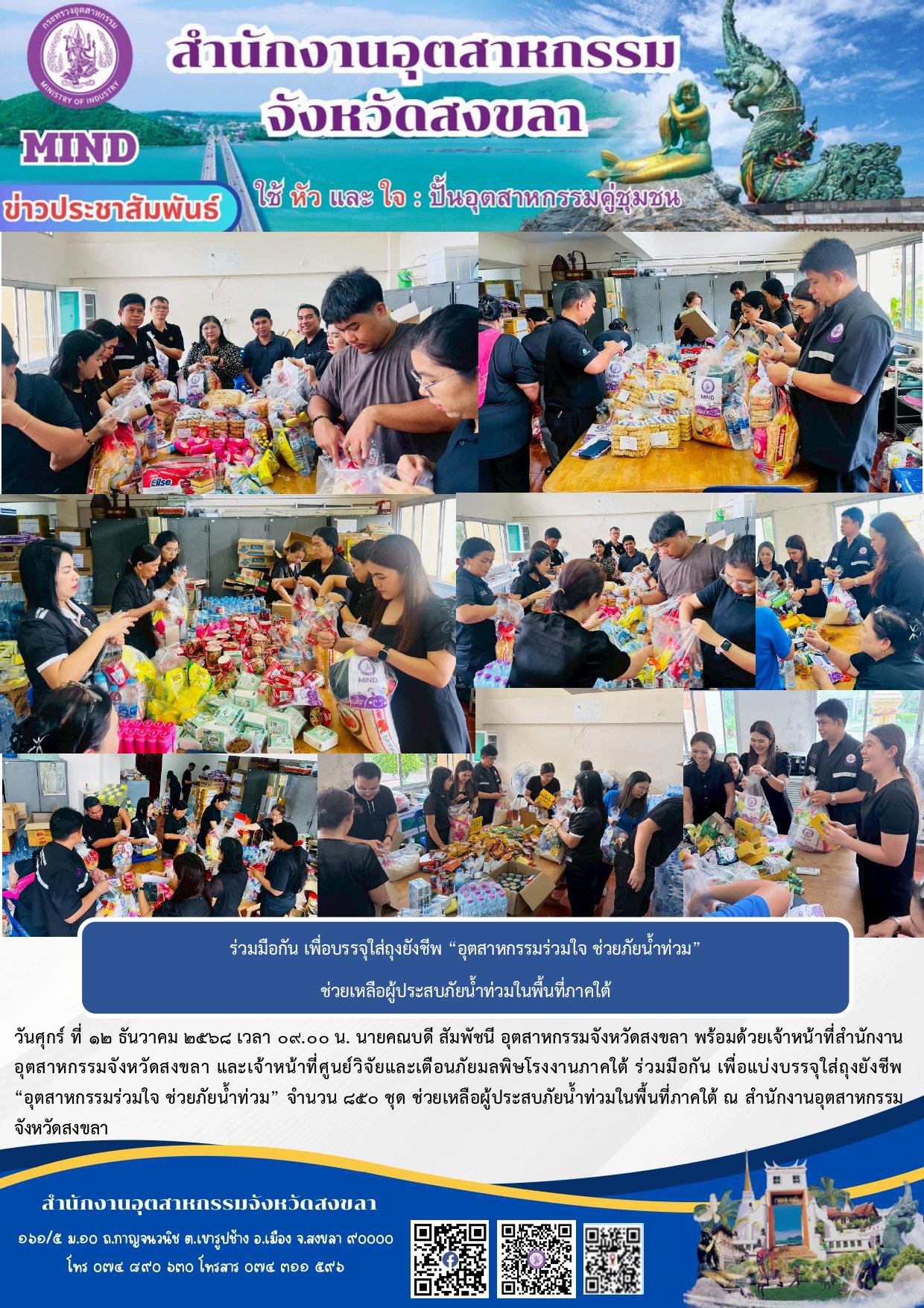 วันศุกร์ ที่ 12 ธันวาคม 2568 เวลา 09.00 น. นายคณบดี สัมพัชนี อุตสาหกรรมจังหวัดสงขลา พร้อมด้วยเจ้าหน้าที่สำนักงานอุตสาหกรรมจังหวัดสงขลา และเจ้าหน้าที่ศูนย์วิจัยและเตือนภัยมลพิษโรงงานภาคใต้ ร่วมมือกัน เพื่อแบ่งบรรจุใส่ถุงยังชีพ “อุตสาหกรรมร่วมใจ ช่วยภัยน้ำท่วม” จำนวน 850 ชุด ช่วยเหลือผู้ประสบภัยน้ำท่วมในพื้นที่ภาคใต้ ณ สำนักงานอุตสาหกรรมจังหวัดสงขลา