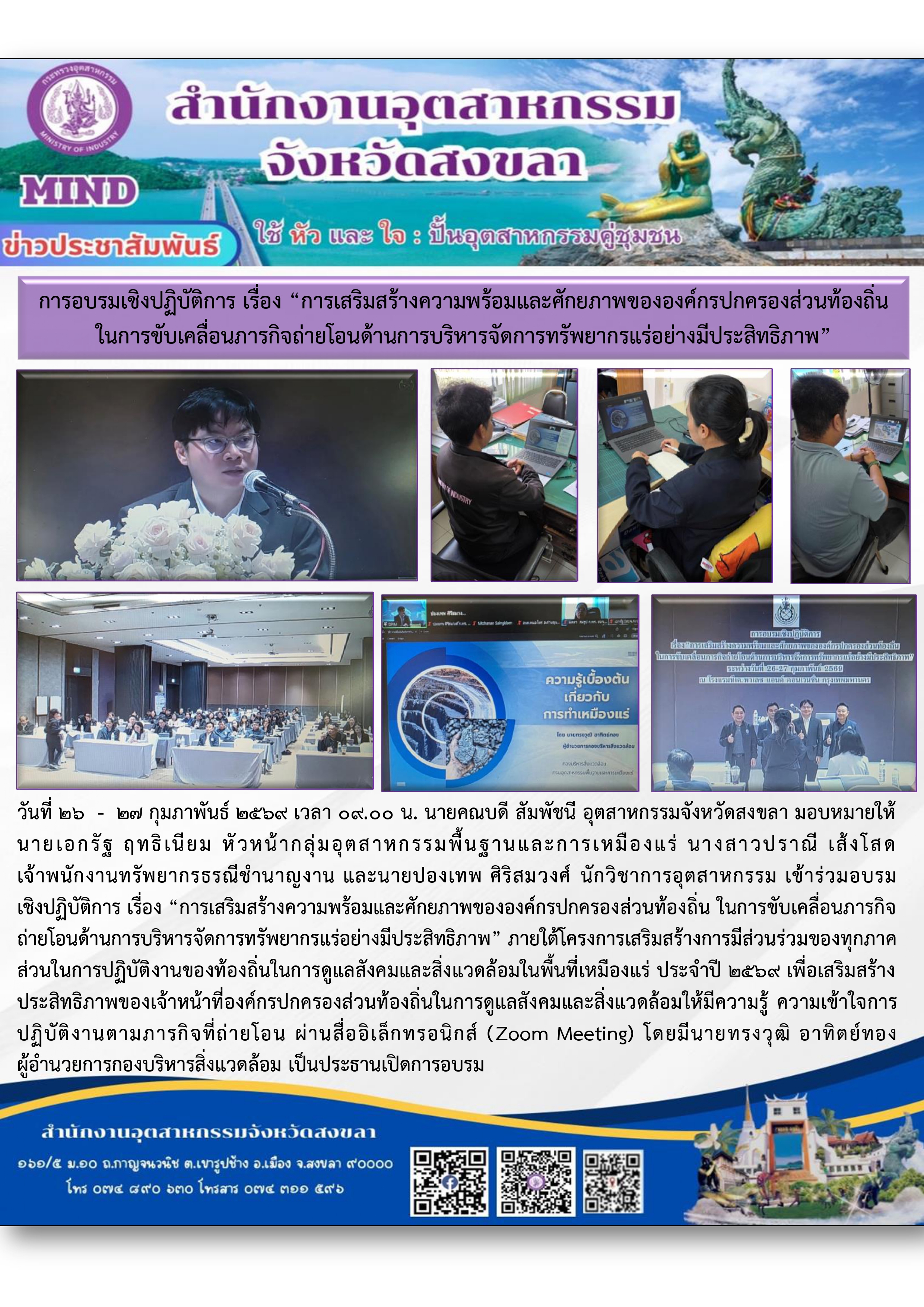 วันที่ 26 - 27 กุมภาพันธ์ 2569 เวลา 09.00 น. นายคณบดี สัมพัชนี อุตสาหกรรมจังหวัดสงขลา มอบหมายให้ นายเอกรัฐ ฤทธิเนียม หัวหน้ากลุ่มอุตสาหกรรมพื้นฐานและการเหมืองแร่ นางสาวปราณี เส้งโสด