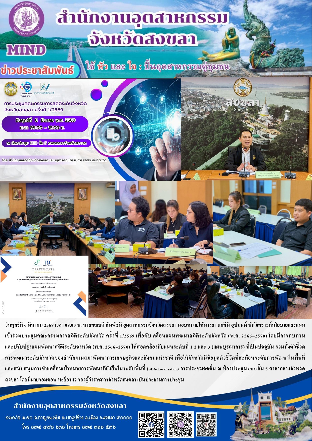 วันศุกร์ที่ 6 มีนาคม 2569 เวลา 09.00 น. นายคณบดี สัมพัชนี อุตสาหกรรมจังหวัดสงขลา มอบหมายให้นางสาวเกศินี อุปมนต์ นักวิเคราะห์นโยบายและแผน เข้าร่วมประชุมคณะกรรมการสถิติระดับจังหวัด ครั้งที่ 1/2569 เพื่อขับเคลื่อนแผนพัฒนาสถิติระดับจังหวัด (พ.ศ. 2566–2570) โดยมีการทบทวน และปรับปรุงแผนพัฒนาสถิติระดับจังหวัด (พ.ศ. 2566–2570) ให้สอดคล้องกับแผนระดับที่ 1 2 และ 3 (แผนบูรณาการ) ที่เป็นปัจจุบัน รวมทั้งตัวชี้วัด การพัฒนาระดับจังหวัดของสำนักงานสภาพัฒนาการเศรษฐกิจและสังคมแห่งชาติ เพื่อให้จังหวัดมีข้อมูลตัวชี้วัดที่สะท้อนระดับการพัฒนาในพื้นที่ และสนับสนุนการขับเคลื่อนเป้าหมายการพัฒนาที่ยั่งยืนในระดับพื้นที่ (SDG Localization) การประชุมจัดขึ้น ณ ห้องประชุม CEO ชั้น 5 ศาลากลางจังหวัดสงขลา โดยมีนายรอมดอน หะยีอาแว รองผู้ว่าราชการจังหวัดสงขลา เป็นประธานการประชุม