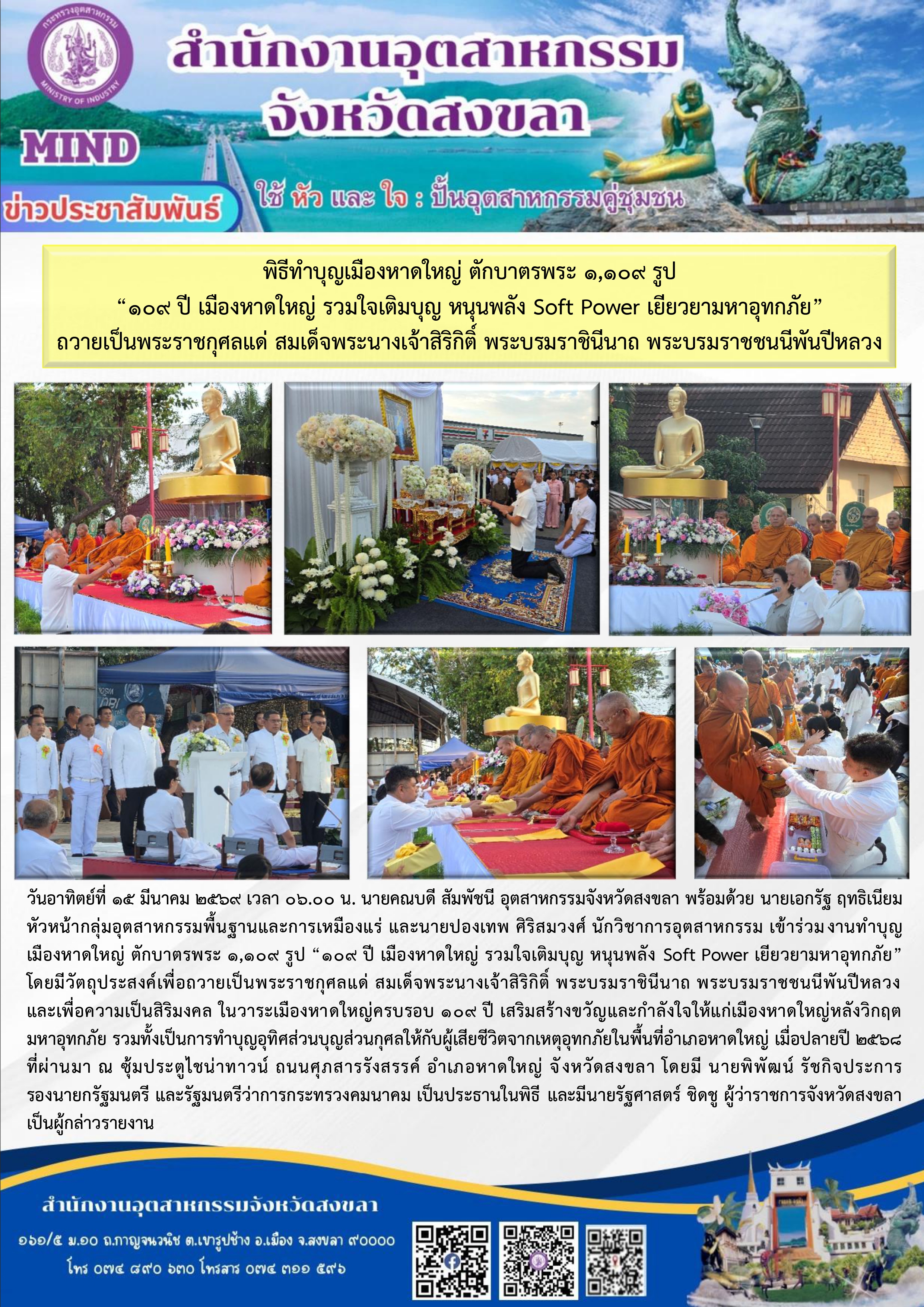 เข้าร่วมงานทำบุญ เมืองหาดใหญ่ ตักบาตรพระ 1,109 รูป “109 ปี เมืองหาดใหญ่ รวมใจเติมบุญ หนุนพลัง Soft Power เยียวยามหาอุทกภัย”