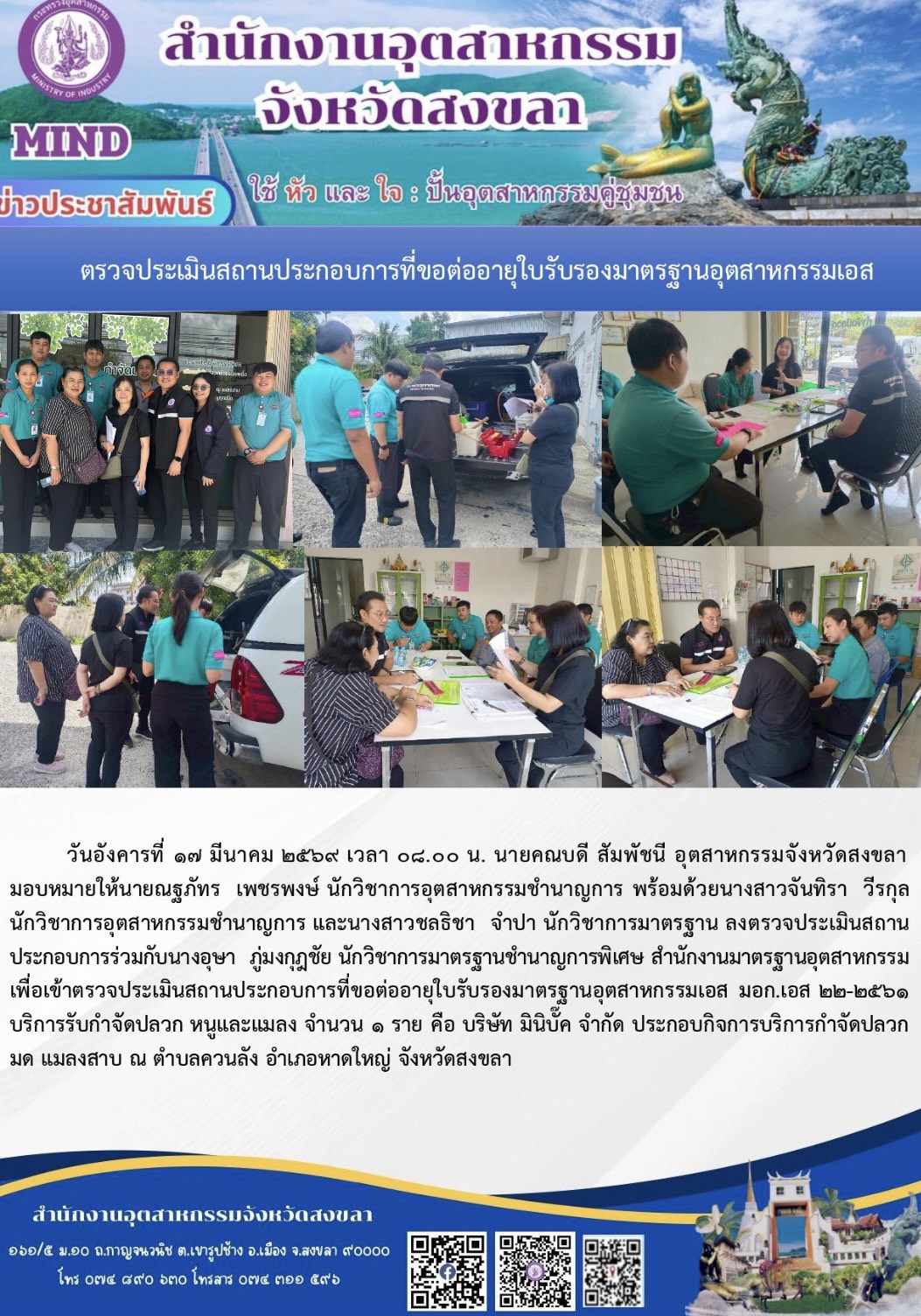 วันอังคารที่ 17 มีนาคม 2569 เวลา 08.00 น. นายคณบดี สัมพัชนี อุตสาหกรรมจังหวัดสงขลา มอบหมายให้นายณฐภัทร เพชรพงษ์ นักวิชาการอุตสาหกรรมชำนาญการ พร้อมด้วยนางสาวจันทิรา วีรกุล นักวิชาการอุตสาหกรรมชำนาญการ และนางสาวชลธิชา จำปา นักวิชาการมาตรฐาน ลงตรวจประเมินสถานประกอบการร่วมกับนางอุษา ภู่มงกุฎชัย นักวิชาการมาตรฐานชำนาญการพิเศษ สำนักงานมาตรฐานอุตสาหกรรม เพื่อเข้าตรวจประเมินสถานประกอบการที่ขอต่ออายุใบรับรองมาตรฐานอุตสาหกรรมเอส มอก.เอส 22-2561 บริการรับกำจัดปลวก หนูและแมลง จำนวน 1 ราย คือ บริษัท มินิบั๊ค จำกัด ประกอบกิจการบริการกำจัดปลวก มด แมลงสาบ ณ ตำบลควนลัง อำเภอหาดใหญ่ จังหวัดสงขลา