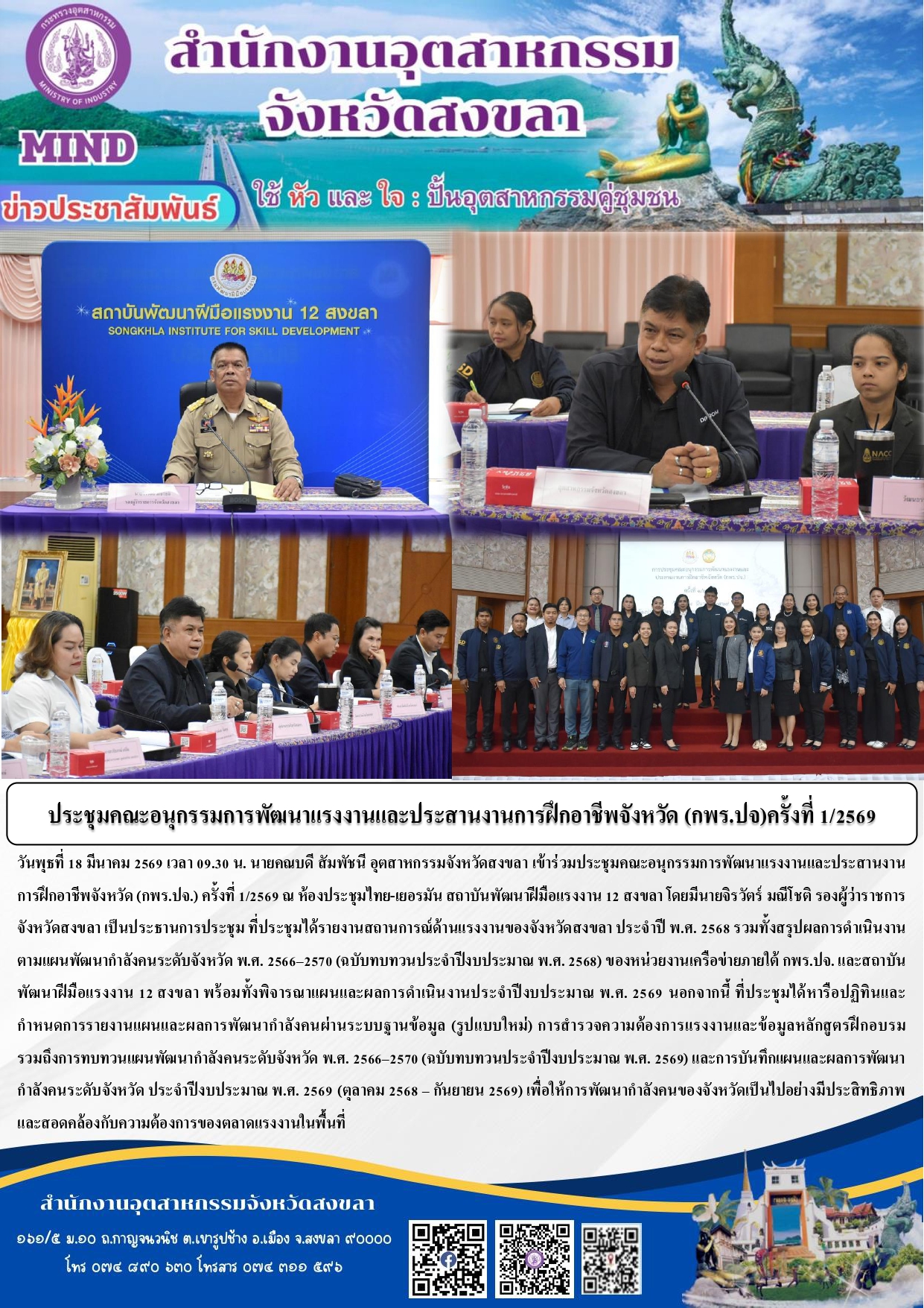 วันพุธที่ 18 มีนาคม 2569 เวลา 09.30 น. นายคณบดี สัมพัชนี อุตสาหกรรมจังหวัดสงขลา เข้าร่วมประชุมคณะอนุกรรมการพัฒนาแรงงานและประสานงานการฝึกอาชีพจังหวัด (กพร.ปจ.) ครั้งที่ 1/2569 ณ ห้องประชุมไทย-เยอรมัน สถาบันพัฒนาฝีมือแรงงาน 12 สงขลา โดยมีนายจิรวัตร์ มณีโชติ รองผู้ว่าราชการจังหวัดสงขลา เป็นประธานการประชุม ที่ประชุมได้รายงานสถานการณ์ด้านแรงงานของจังหวัดสงขลา ประจำปี พ.ศ. 2568 รวมทั้งสรุปผลการดำเนินงานตามแผนพัฒนากำลังคนระดับจังหวัด พ.ศ. 2566–2570 (ฉบับทบทวนประจำปีงบประมาณ พ.ศ. 2568) ของหน่วยงานเครือข่ายภายใต้ กพร.ปจ. และสถาบันพัฒนาฝีมือแรงงาน 12 สงขลา พร้อมทั้งพิจารณาแผนและผลการดำเนินงานประจำปีงบประมาณ พ.ศ. 2569 นอกจากนี้ ที่ประชุมได้หารือปฏิทินและกำหนดการรายงานแผนและผลการพัฒนากำลังคนผ่านระบบฐานข้อมูล (รูปแบบใหม่) การสำรวจความต้องการแรงงานและข้อมูลหลักสูตรฝึกอบรม รวมถึงการทบทวนแผนพัฒนากำลังคนระดับจังหวัด พ.ศ. 2566–2570 (ฉบับทบทวนประจำปีงบประมาณ พ.ศ. 2569) และการบันทึกแผนและผลการพัฒนากำลังคนระดับจังหวัด ประจำปีงบประมาณ พ.ศ. 2569 (ตุลาคม 2568 – กันยายน 2569) เพื่อให้การพัฒนากำลังคนของจังหวัดเป็นไปอย่างมีประสิทธิภาพและสอดคล้องกับความต้องการของตลาดแรงงานในพื้นที่