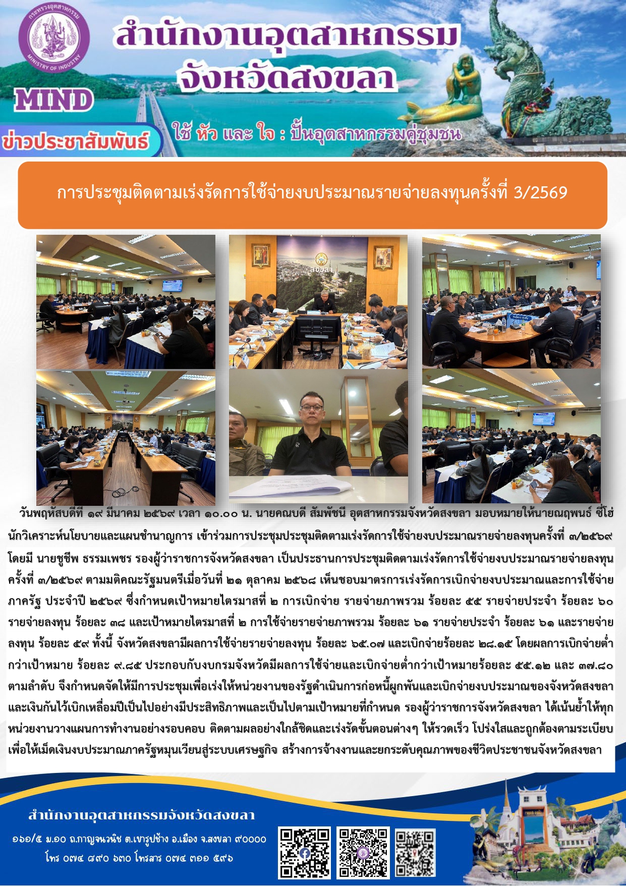 วันพฤหัสบดีที่ 19 มีนาคม 2569 เวลา 10.00 น. นายคณบดี สัมพัชนี อุตสาหกรรมจังหวัดสงขลา มอบหมายให้นายณฤพนธ์ ซี่โฮ่