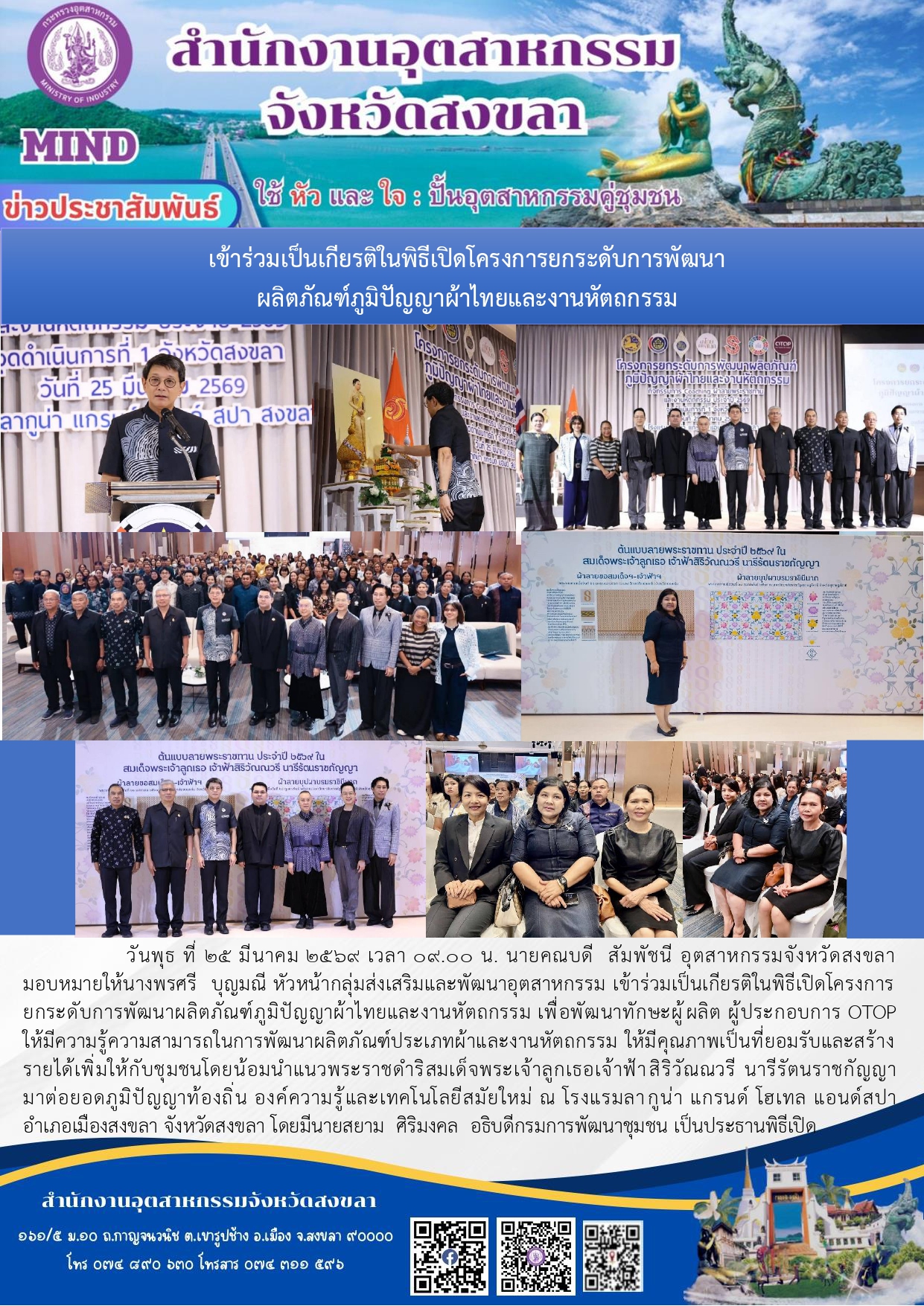 วันพุธ ที่ 25 มีนาคม 2569 เวลา 09.00 น. นายคณบดี สัมพัชนี อุตสาหกรรมจังหวัดสงขลา มอบหมายให้นางพรศรี บุญมณี หัวหน้ากลุ่มส่งเสริมและพัฒนาอุตสาหกรรม เข้าร่วมเป็นเกียรติในพิธีเปิดโครงการยกระดับการพัฒนาผลิตภัณฑ์ภูมิปัญญาผ้าไทยและงานหัตถกรรม เพื่อพัฒนาทักษะผู้ผลิต ผู้ประกอบการ OTOP