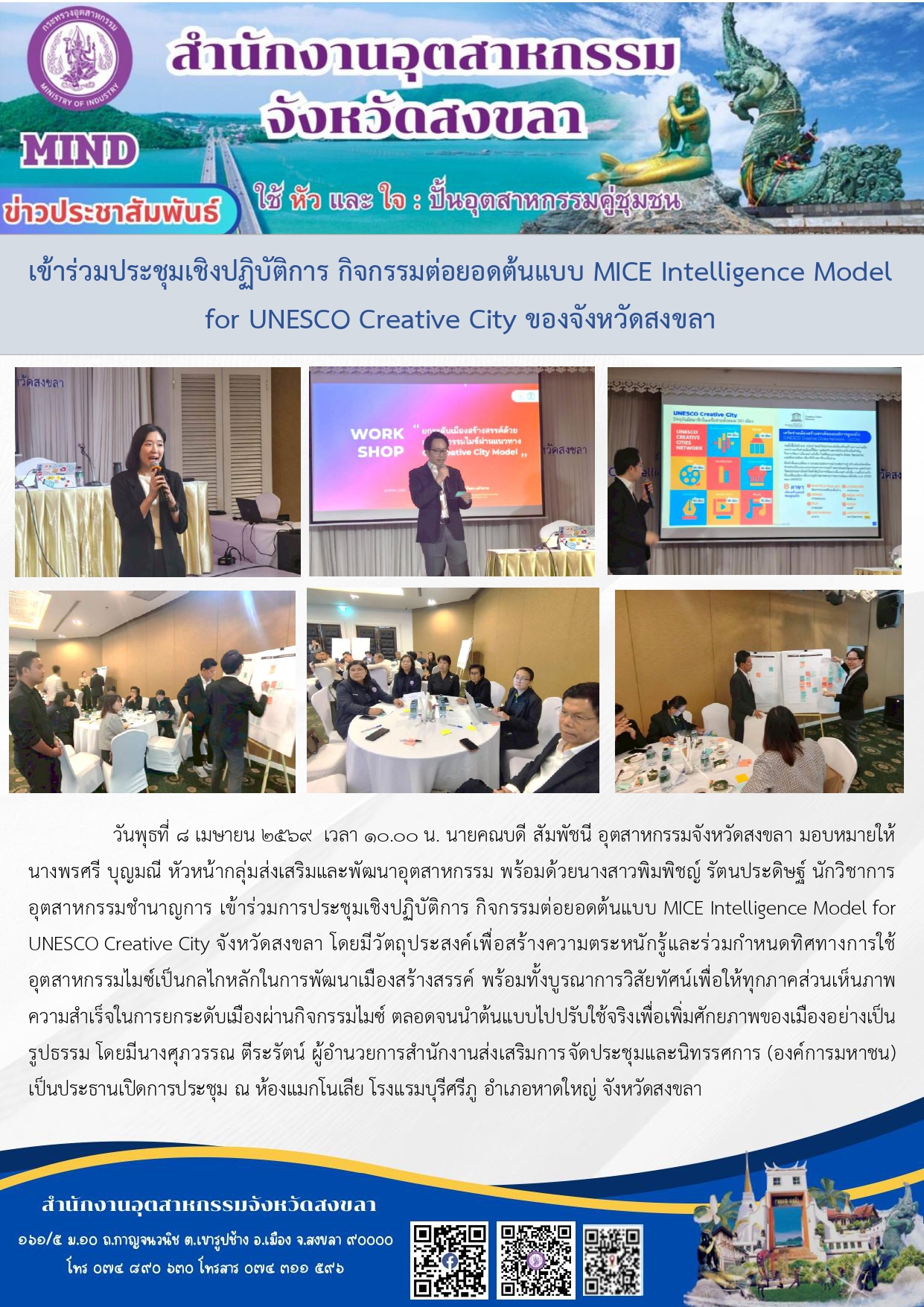 วันพุธที่ 8 เมษายน 2569 เวลา 10.00 น. นายคณบดี สัมพัชนี อุตสาหกรรมจังหวัดสงขลา มอบหมายให้ นางพรศรี บุญมณี หัวหน้ากลุ่มส่งเสริมและพัฒนาอุตสาหกรรม พร้อมด้วยนางสาวพิมพิชญ์ รัตนประดิษฐ์ นักวิชาการอุตสาหกรรมชำนาญการ เข้าร่วมการประชุมเชิงปฏิบัติการ กิจกรรมต่อยอดต้นแบบ MICE Intelligence Model for UNESCO Creative City จังหวัดสงขลา โดยมีวัตถุประสงค์เพื่อสร้างความตระหนักรู้และร่วมกำหนดทิศทางการใช้อุตสาหกรรมไมซ์เป็นกลไกหลักในการพัฒนาเมืองสร้างสรรค์ พร้อมทั้งบูรณาการวิสัยทัศน์เพื่อให้ทุกภาคส่วนเห็นภาพความสำเร็จในการยกระดับเมืองผ่านกิจกรรมไมซ์ ตลอดจนนำต้นแบบไปปรับใช้จริงเพื่อเพิ่มศักยภาพของเมืองอย่างเป็นรูปธรรม โดยมีนางศุภวรรณ ตีระรัตน์ ผู้อำนวยการสำนักงานส่งเสริมการจัดประชุมและนิทรรศการ (องค์การมหาชน) เป็นประธานเปิดการประชุม ณ ห้องแมกโนเลีย โรงแรมบุรีศรีภู อำเภอหาดใหญ่ จังหวัดสงขลา