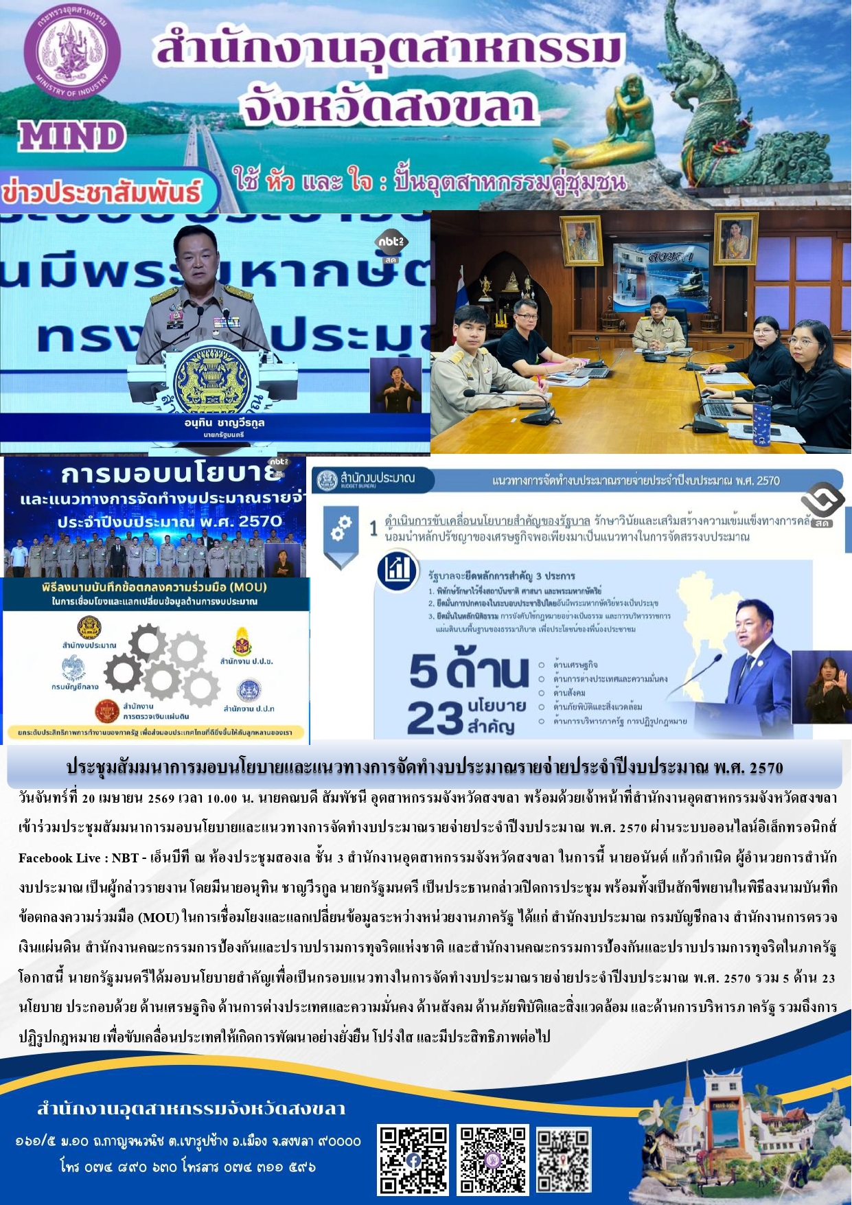 วันจันทร์ที่ 20 เมษายน 2569 เวลา 10.00 น. นายคณบดี สัมพัชนี อุตสาหกรรมจังหวัดสงขลา พร้อมด้วยเจ้าหน้าที่สำนักงานอุตสาหกรรมจังหวัดสงขลา เข้าร่วมประชุมสัมมนาการมอบนโยบายและแนวทางการจัดทำงบประมาณรายจ่ายประจำปีงบประมาณ พ.ศ. 2570 ผ่านระบบออนไลน์อิเล็กทรอนิกส์ Facebook Live : NBT - เอ็นบีที ณ ห้องประชุมสองเล ชั้น 3 สำนักงานอุตสาหกรรมจังหวัดสงขลา ในการนี้ นายอนันต์ แก้วกำเนิด ผู้อำนวยการสำนักงบประมาณ เป็นผู้กล่าวรายงาน โดยมีนายอนุทิน ชาญวีรกูล นายกรัฐมนตรี เป็นประธานกล่าวเปิดการประชุม พร้อมทั้งเป็นสักขีพยานในพิธีลงนามบันทึกข้อตกลงความร่วมมือ (MOU) ในการเชื่อมโยงและแลกเปลี่ยนข้อมูลระหว่างหน่วยงานภาครัฐ ได้แก่ สำนักงบประมาณ กรมบัญชีกลาง สำนักงานการตรวจเงินแผ่นดิน สำนักงานคณะกรรมการป้องกันและปราบปรามการทุจริตแห่งชาติ และสำนักงานคณะกรรมการป้องกันและปราบปรามการทุจริตในภาครัฐ โอกาสนี้ นายกรัฐมนตรีได้มอบนโยบายสำคัญเพื่อเป็นกรอบแนวทางในการจัดทำงบประมาณรายจ่ายประจำปีงบประมาณ พ.ศ. 2570 รวม 5 ด้าน 23 นโยบาย ประกอบด้วย ด้านเศรษฐกิจ ด้านการต่างประเทศและความมั่นคง ด้านสังคม ด้านภัยพิบัติและสิ่งแวดล้อม และด้านการบริหารภาครัฐ รวมถึงการปฏิรูปกฎหมาย เพื่อขับเคลื่อนประเทศให้เกิดการพัฒนาอย่างยั่งยืน โปร่งใส และมีประสิทธิภาพต่อไป