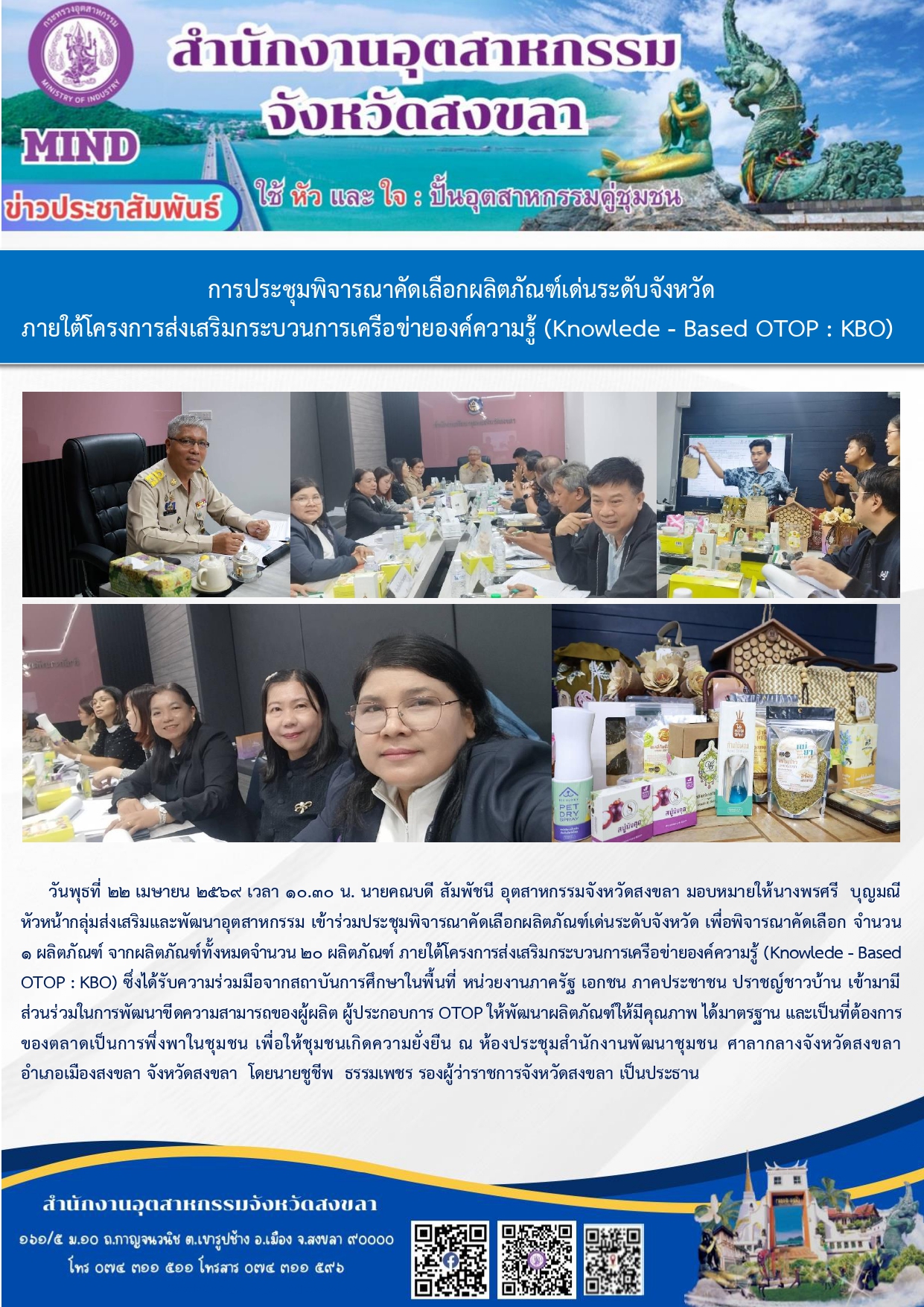วันพุธที่ 22 เมษายน 2569 เวลา 10.30 น. นายคณบดี สัมพัชนี อุตสาหกรรมจังหวัดสงขลา มอบหมายให้นางพรศรี บุญมณี หัวหน้ากลุ่มส่งเสริมและพัฒนาอุตสาหกรรม เข้าร่วมประชุมพิจารณาคัดเลือกผลิตภัณฑ์เด่นระดับจังหวัด เพื่อพิจารณาคัดเลือก จำนวน 1 ผลิตภัณฑ์ จากผลิตภัณฑ์ทั้งหมดจำนวน 20 ผลิตภัณฑ์ ภายใต้โครงการส่งเสริมกระบวนการเครือข่ายองค์ความรู้ (Knowlede - Based OTOP : KBO) ซึ่งได้รับความร่วมมือจากสถาบันการศึกษาในพื้นที่ หน่วยงานภาครัฐ เอกชน ภาคประชาชน ปราชญ์ชาวบ้าน เข้ามามีส่วนร่วมในการพัฒนาขีดความสามารถของผู้ผลิต ผู้ประกอบการ OTOP ให้พัฒนาผลิตภัณฑ์ให้มีคุณภาพ ได้มาตรฐาน และเป็นที่ต้องการของตลาดเป็นการพึ่งพาในชุมชน เพื่อให้ชุมชนเกิดความยั่งยืน ณ ห้องประชุมสำนักงานพัฒนาชุมชน ศาลากลางจังหวัดสงขลา อำเภอเมืองสงขลา จังหวัดสงขลา โดยนายชูชีพ ธรรมเพชร รองผู้ว่าราชการจังหวัดสงขลา เป็นประธาน