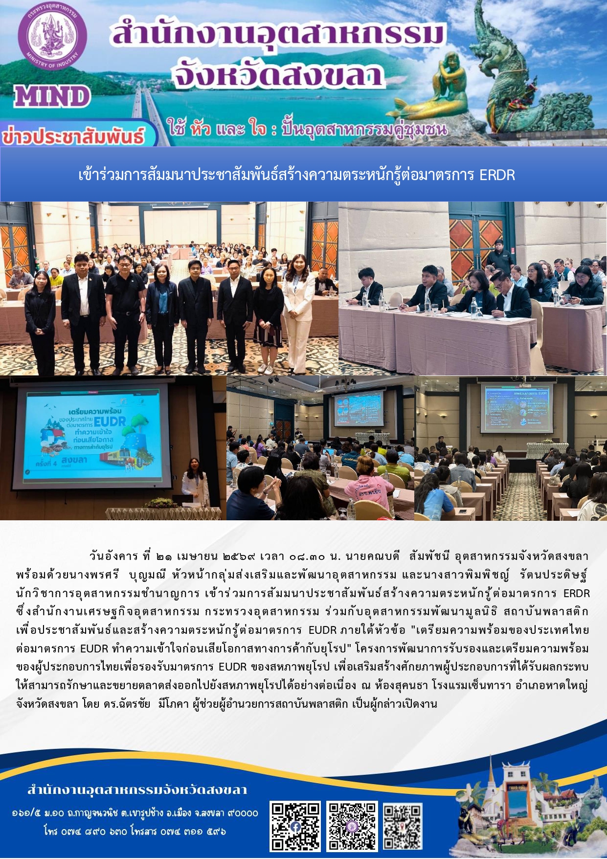 วันอังคาร ที่ 21 เมษายน 2569 เวลา 08.30 น. นายคณบดี สัมพัชนี อุตสาหกรรมจังหวัดสงขลา พร้อมด้วยนางพรศรี บุญมณี หัวหน้ากลุ่มส่งเสริมและพัฒนาอุตสาหกรรม และนางสาวพิมพิชญ์ รัตนประดิษฐ์ นักวิชาการอุตสาหกรรมชำนาญการ เข้าร่วมการสัมมนาประชาสัมพันธ์สร้างความตระหนักรู้ต่อมาตรการ ERDR ซึ่งสำนักงานเศรษฐกิจอุตสาหกรรม กระทรวงอุตสาหกรรม ร่วมกับอุตสาหกรรมพัฒนามูลนิธิ สถาบันพลาสติก เพื่อประชาสัมพันธ์และสร้างความตระหนักรู้ต่อมาตรการ EUDR ภายใต้หัวข้อ "เตรียมความพร้อมของประเทศไทยต่อมาตรการ EUDR ทำความเข้าใจก่อนเสียโอกาสทางการค้ากับยุโรป" โครงการพัฒนาการรับรองและเตรียมความพร้อมของผู้ประกอบการไทยเพื่อรองรับมาตรการ EUDR ของสหภาพยุโรป เพื่อเสริมสร้างศักยภาพผู้ประกอบการที่ได้รับผลกระทบ ให้สามารถรักษาและขยายตลาดส่งออกไปยังสหภาพยุโรปได้อย่างต่อเนื่อง ณ ห้องสุคนธา โรงแรมเซ็นทารา อำเภอหาดใหญ่ จังหวัดสงขลา โดย ดร.ฉัตรชัย มีโภคา ผู้ช่วยผู้อำนวยการสถาบันพลาสติก เป็นผู้กล่าวเปิดงาน